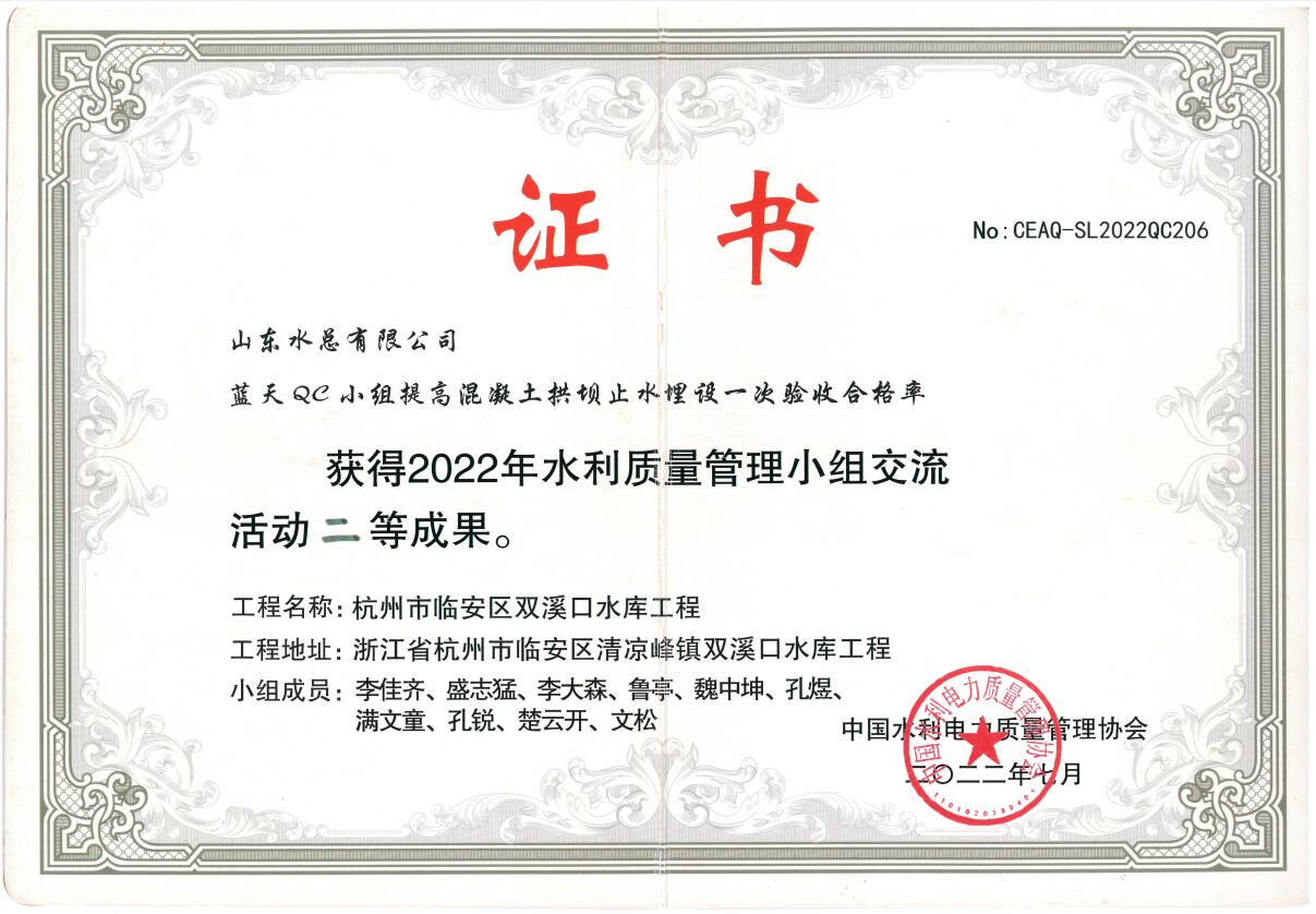 近日,中国水利电力质量管理协会2022年水利质量管理小组交流活动结果与获奖名单揭晓,公司申报的《提高钢坝闸闸墙外观质量一次验收合格率》获得一等成果、《提高混凝土拱坝止水埋设一次验收合格率》《提高大体积现浇混凝土强约束区温度控制水平》《提高坝基帷幕灌浆施工质量一次验收合格率》3项成果获得二等成果。