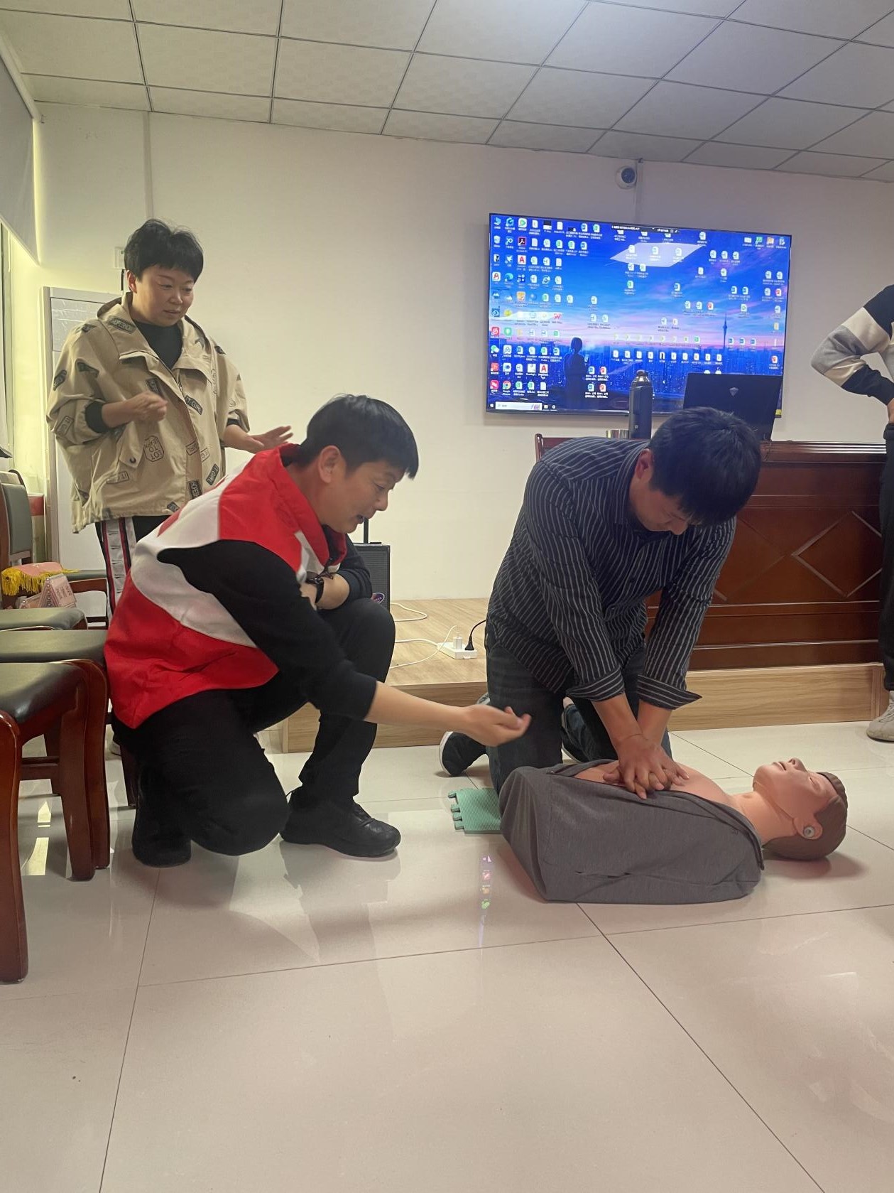 此次培训邀请临沂市红十字会的专业讲师,通过理论讲解、现场演示、实践操作和模拟演练等形式,为一线职工开展生动细致的急救教学,内容涉及心肺复苏、海姆立克急救法、创伤救护、常见急症和意外伤害处理等多个方面。在心肺复苏实操环节,讲师利用模拟人详细演示了胸外按压、人工呼吸的操作要点和注意事项,指导学员逐一练习,确保每人都能熟练掌握此项关键技能。创伤救护课程中,学员认真学习止血、包扎和固定技术并进行实操,培训现场学习氛围浓厚。