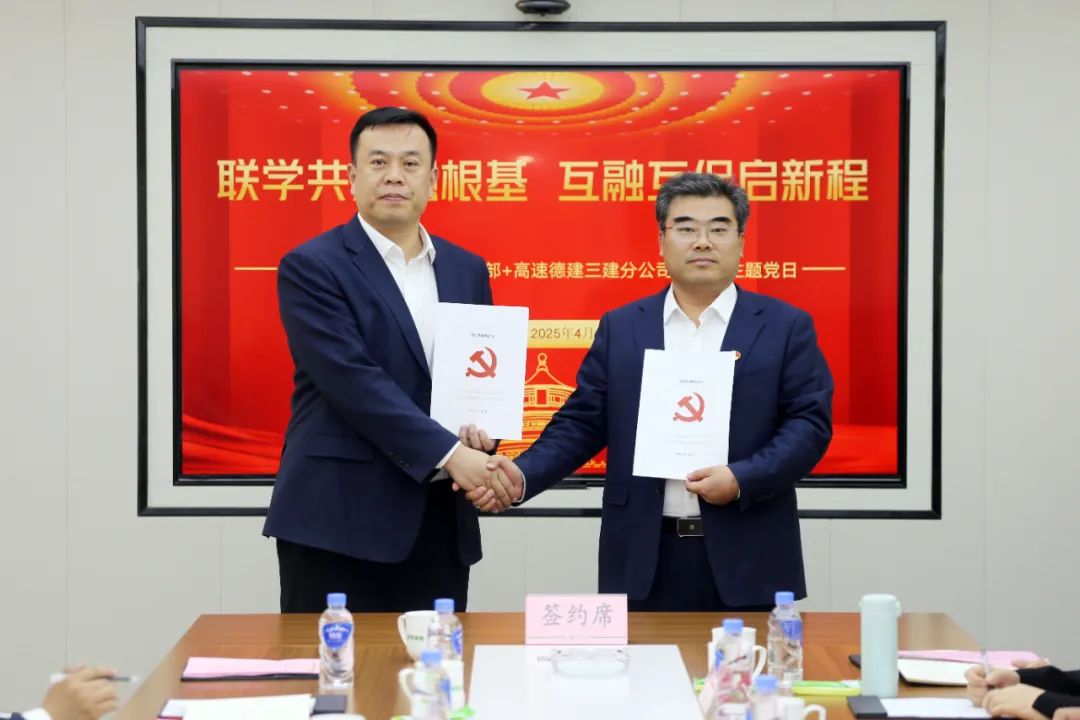 交流会上,山东水总第五分公司党支部书记蔡国森同志、山东高速德建三建分公司党支部书记李杰同志共同签订《党建结对共建合作协议》,并就支部工作开展情况进行简要介绍,对共同抓好党建共建,服务项目高质量建设进行交流。