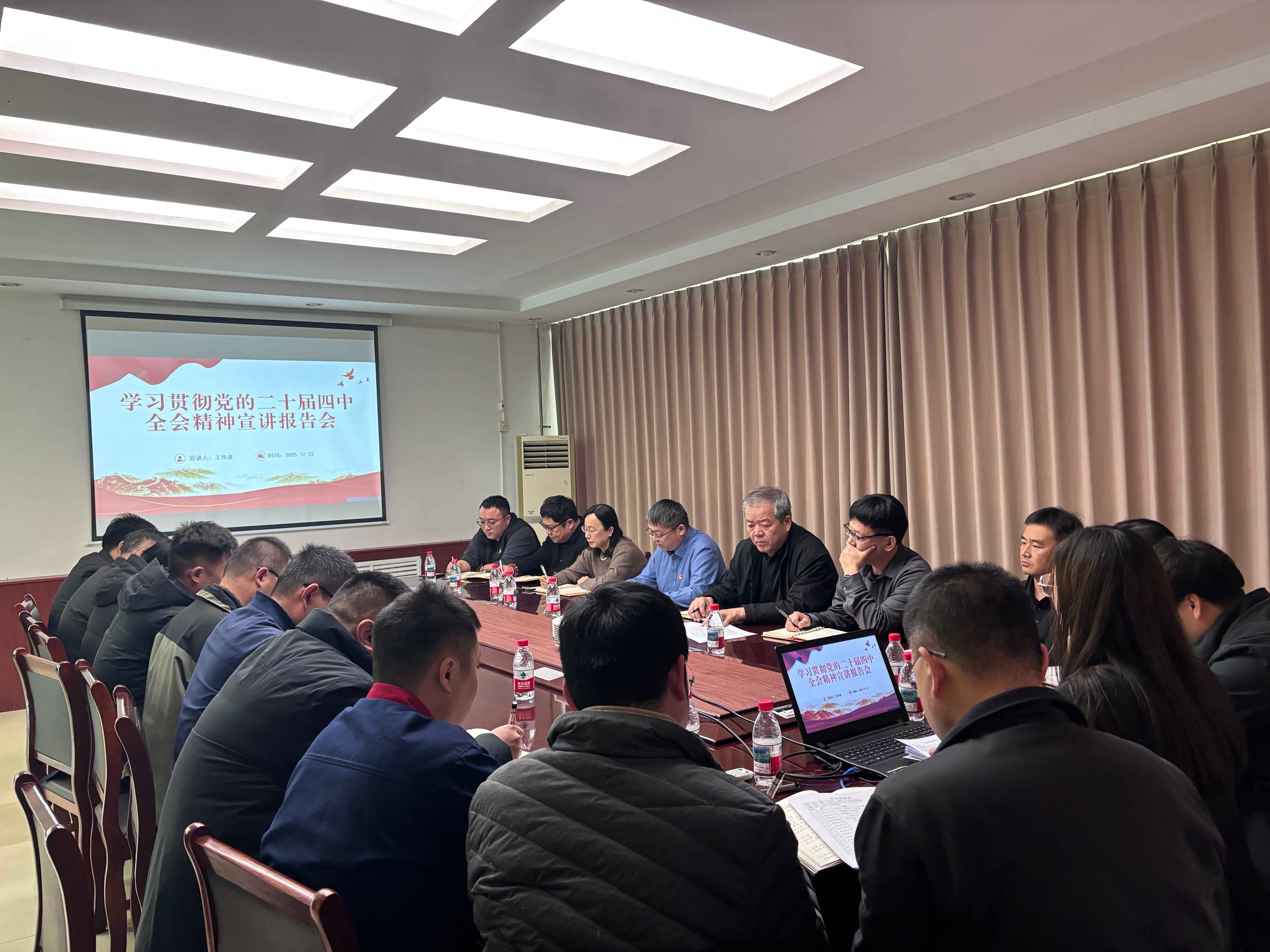 为深入学习贯彻党的二十届四中全会精神,落实上级党委部署要求,12月22日,二局有限公司(水工机械公司)组织召开专题宣讲报告会。二局公司党委书记、董事长、总经理王传波作题为《深学笃行全会精神  实干担当谱写新篇》的宣讲报告。会议采用“线上+线下”形式举行,公司领导班子成员、中层副职及以上管理人员、各党支部党员共29人参加。